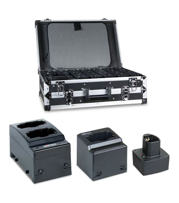 MIPRO 發射器與電池組專用的充電解決方案,提供多槽式充電器與收納箱設計,方便集中充電與保管。