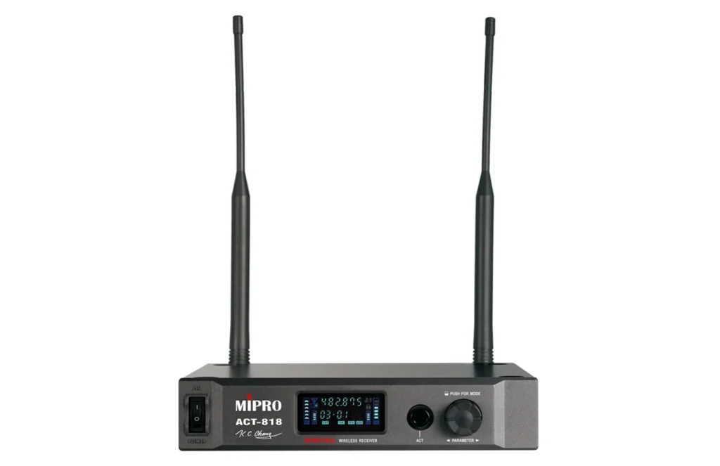 ACT-818 為單頻道數位接收機,具 72 MHz 寬頻接收電路、數位選訊接收與 256-bit 加密功能。提供穩定 RF 與優異音質,並整合 AES/EBU、Wordclock 與 MWC 軟體,適用專業舞台與工程安裝。