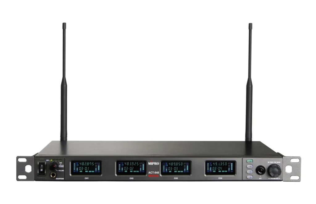 ACT-848 為四頻道數位接收機,採用 72 MHz 寬頻接收電路、數位選訊接收與 256-bit 加密功能。具穩定 RF 表現與清晰音質,並整合 Dante、AES/EBU、Wordclock 與 MWC 軟體,適合多頻道專業系統。